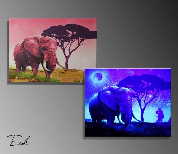 Peinture sur toile, acrylique fluo et peinture invisible offrant une vue de jour et une vue de nuit.
